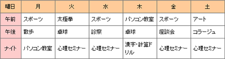 - サンシャインでは、1日3回、様々なプログラムを準備しています。身体を動かしてリフレッシュする運動系のプログラムや、手先や完成を磨く芸術分野のプログラム、職場でも家庭でも必要とされるようになってきているパソコン技術を磨くためのプログラムなど、今後の人生を豊かにできるようなプログラムを実施しております。