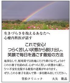 ![]() わたしは心のつらさを抱えた多くの方を診療してきました。毎日毎日、患者さんそしてそのご家族のお話をうかがってきました。そして、受診するにいたった経緯をお聞きしてきました。 ある人は仕事のことを、ある人は家族のことを、ある人は学校のことを、ある人は近所のことを、ある人は交通事故のことを原因としてあげました。原因も症状も表面的にみると千差万別です。一見すると、各々の原因と経過はまったく違うように感じてしまうでしょう。 しかし、こころがつらく苦しくなり、どんどん悪化してしまうパターンというのはほぼ同じなのです。この小冊子ではまず、その典型的なパターンの1つをあなたに知っていただきます。この部分を読むだけでも、こころの辛さ・苦しさの悪化防止に大いに役にたつでしょう。 さらにこの小冊子では、今あるこころのつらさに対する効果的な対応方法をお伝えします。 あなたは今まで、こころのつらさに対して具体的にどう対応すればいいのか分からなかったのかもしれません。もしくは、治療情報の洪水の中で、どんな治療方法をどう選びどのように実行すればよいのか、途方に暮れておられたのでしょう。 そういう方にこそ、この小冊子は役にたつ情報満載です。